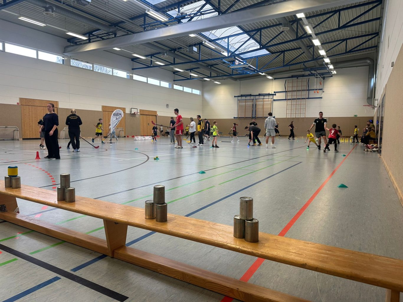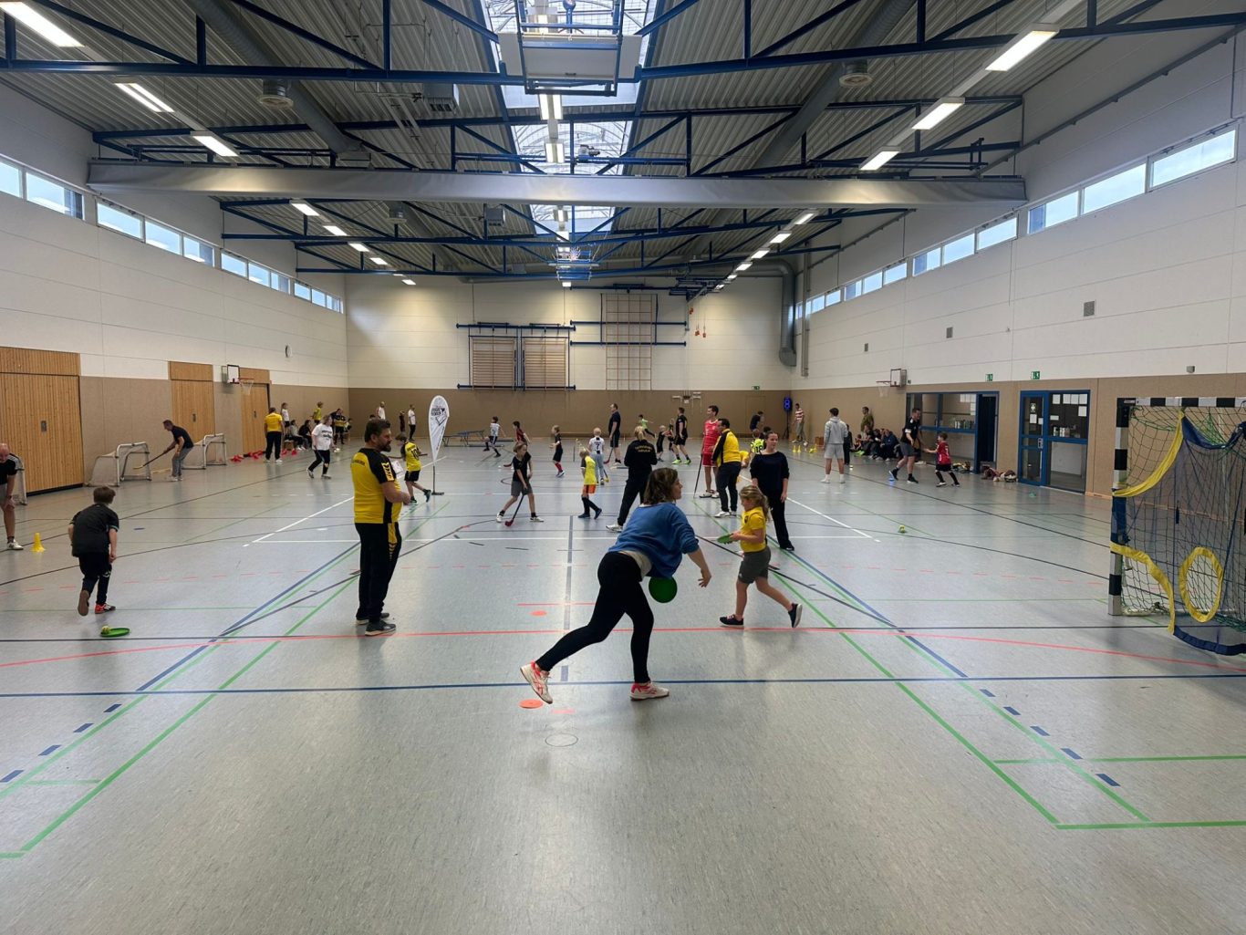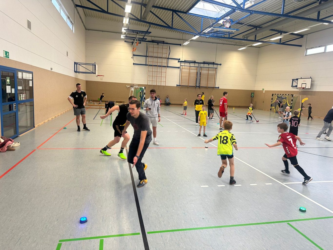 vorbereitet. Dort waren Markierungen auf dem Boden zu finden für lustige Kreisspiele, mit und ohne Bälle, und sogar zwei Falttore,
