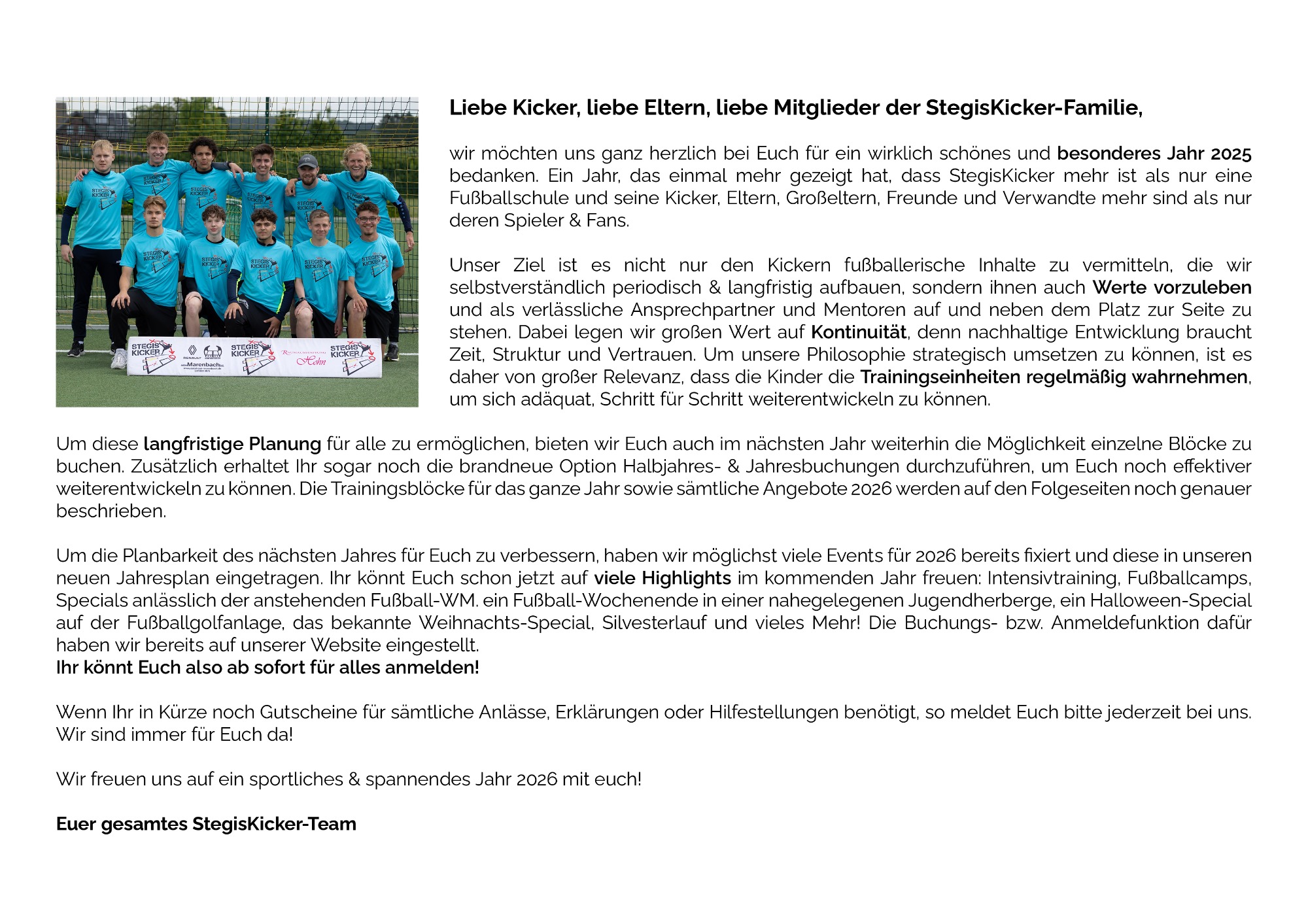 Diese Zusammenarbeit ist für uns etwas ganz Besonderes – nicht nur, weil sie schon so lange besteht, sondern weil sie auf Vertrauen, gemeinsamen Zielen und echter Leidenschaft für den Kinder- und Jugendfußball basiert. Gemeinsam stehen wir für viel Einsatz und hohe Trainingsqualität, echte Förderung und unvergessliche Erlebnisse für die Kinder aus unserer Region.