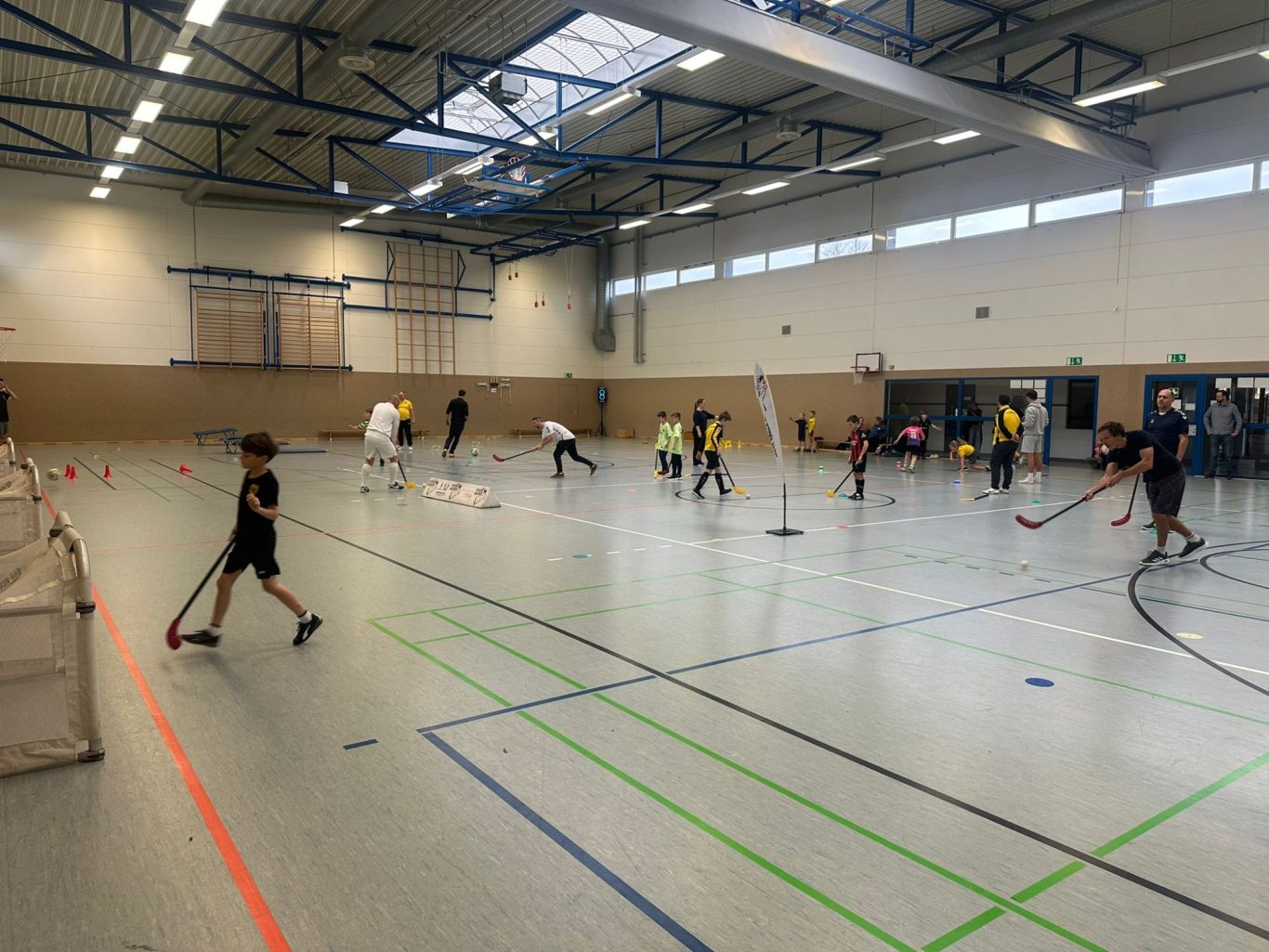 vorbereitet. Dort waren Markierungen auf dem Boden zu finden für lustige Kreisspiele, mit und ohne Bälle, und sogar zwei Falttore,